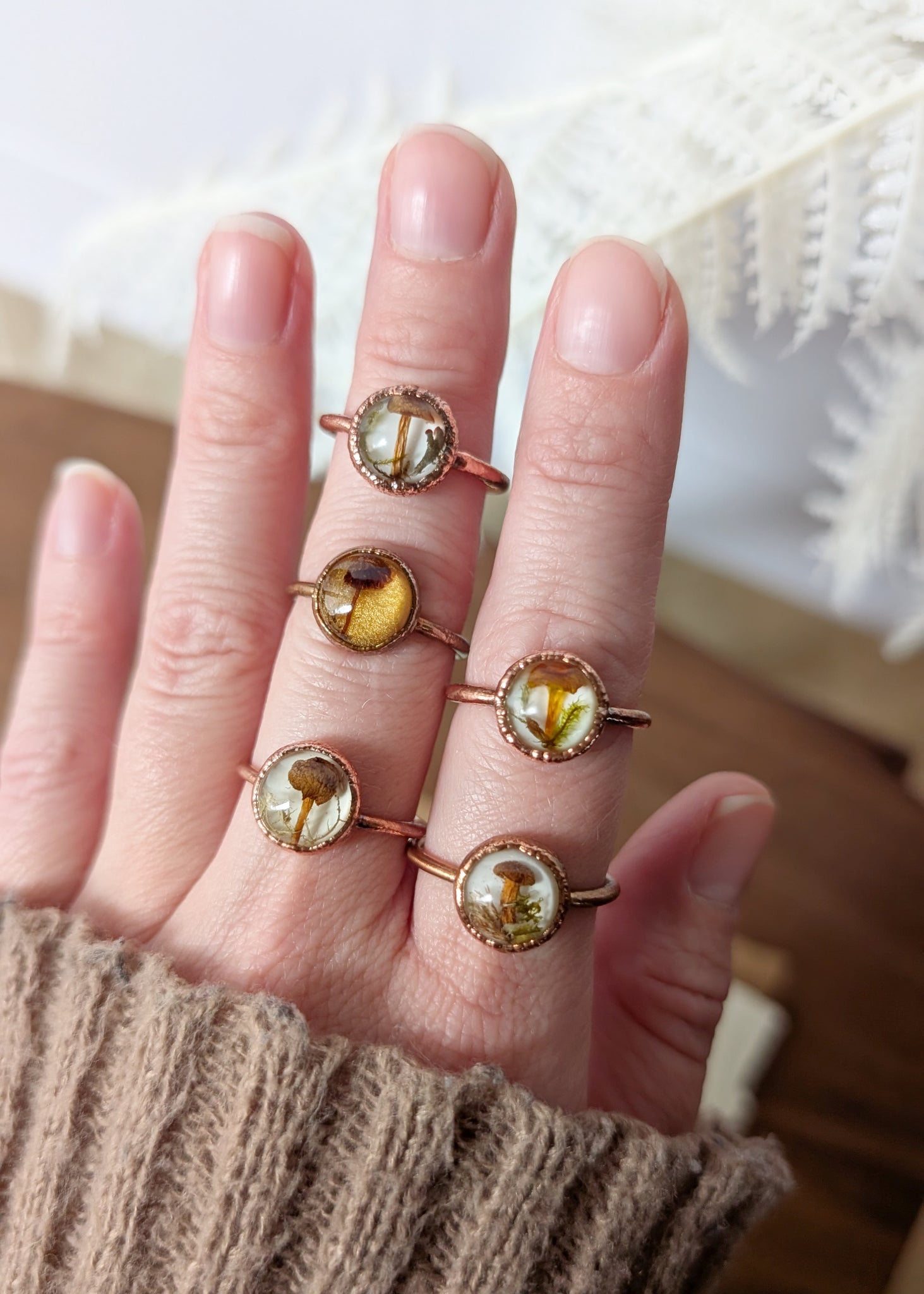Real mushrooms set in resin. Electroplated in pure Copper.