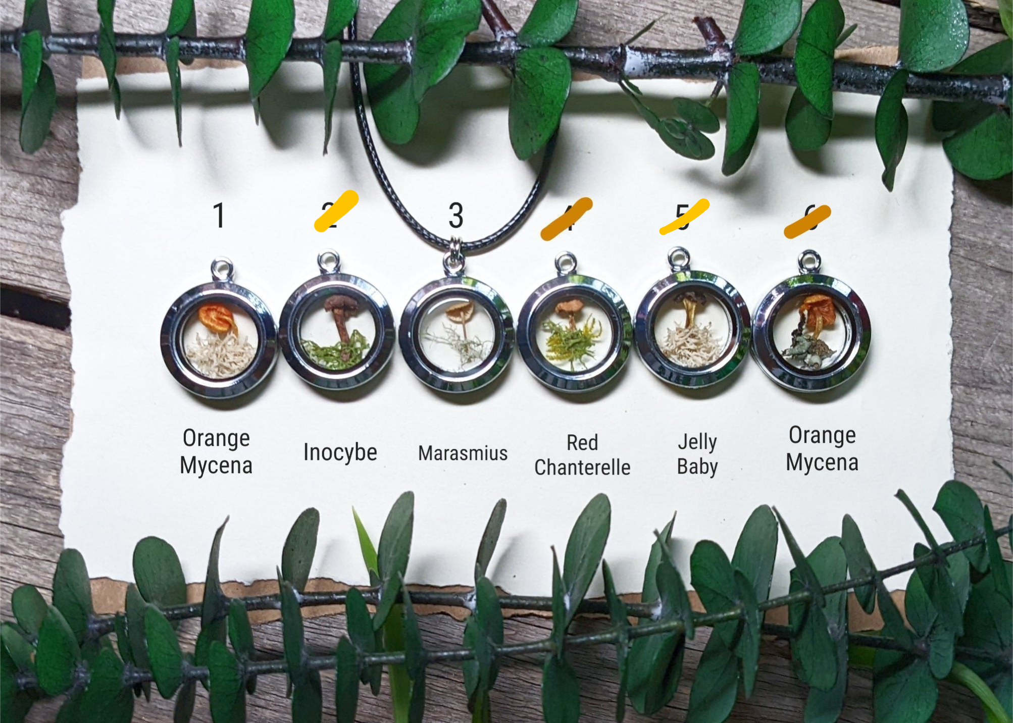 Wild mushrooms, moss and/or lichen -set in a glass and stainless steel locket. Silver Colored.